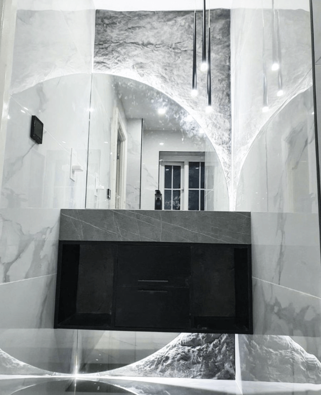 (A) We can design the mirror to adapt to the furniture. Its basically just an LED mirror made with a cut out at the bottom for the furniture to be fixed over the top of the mirror. Some others are made as 2 separate LED mirrors, one fitted above the floating furniture and one below.