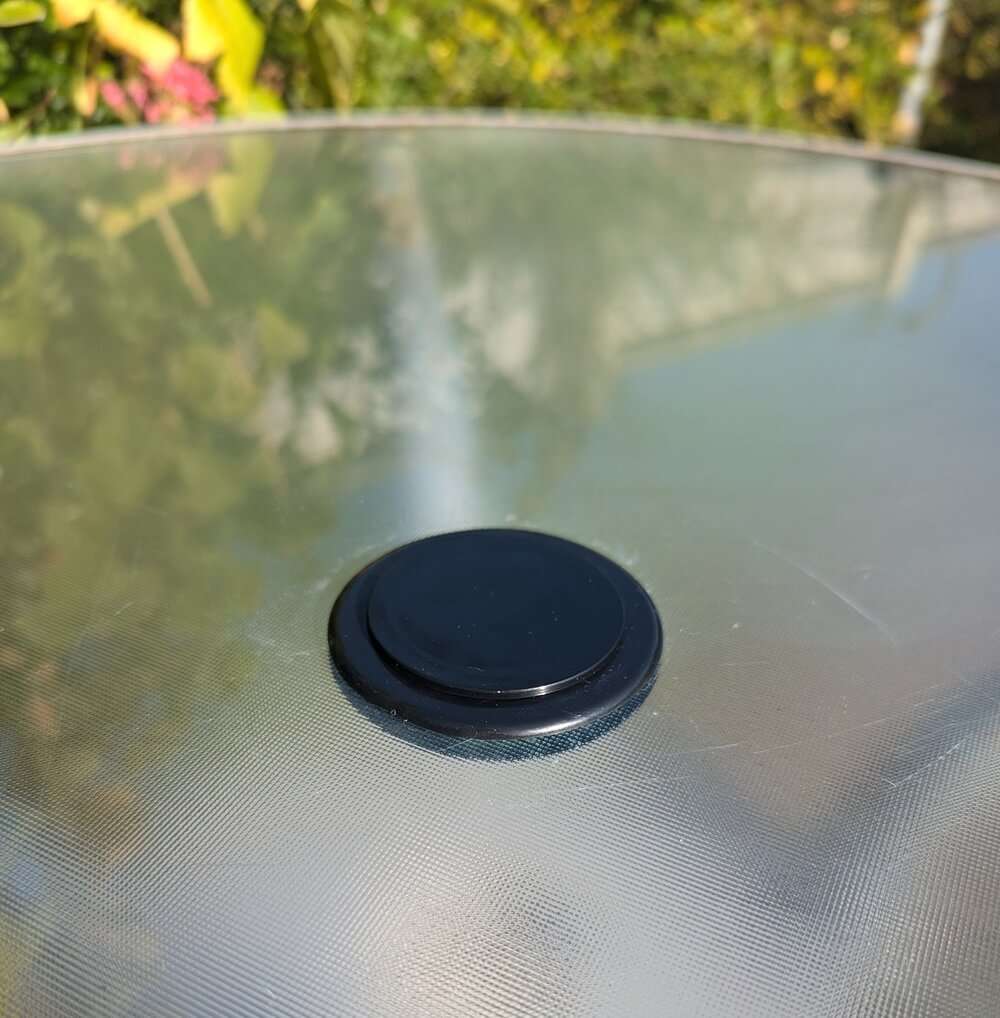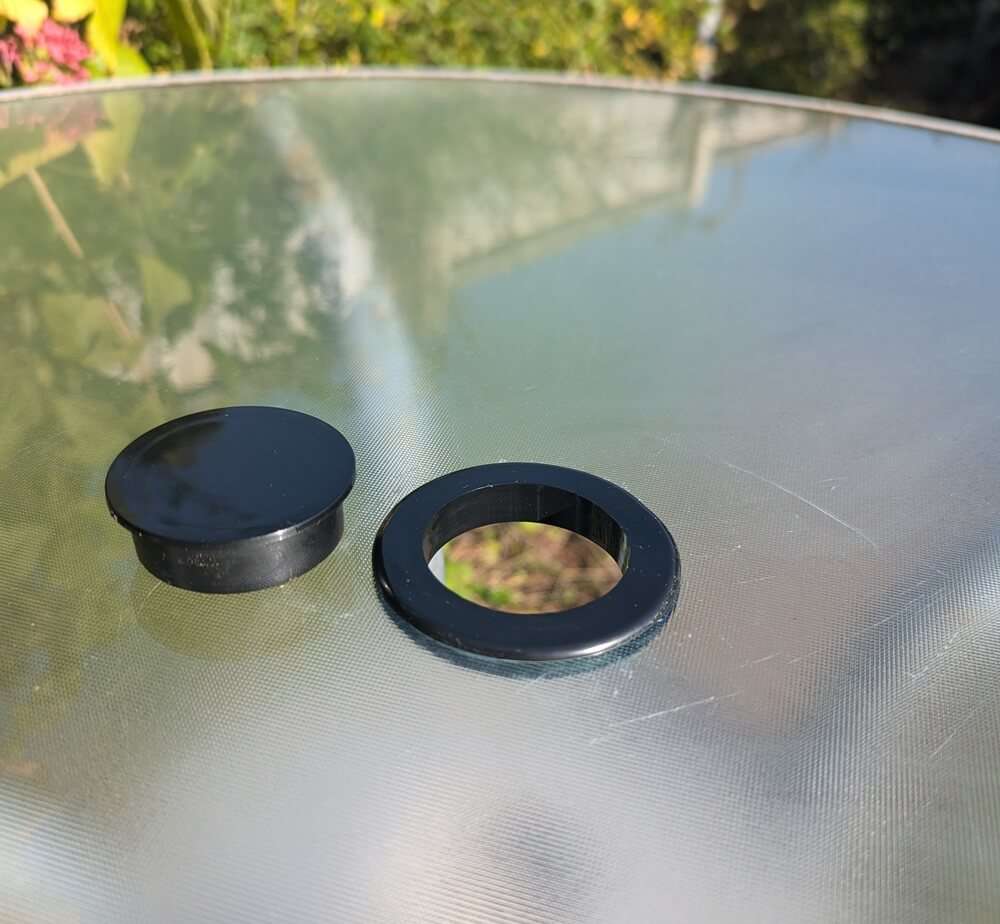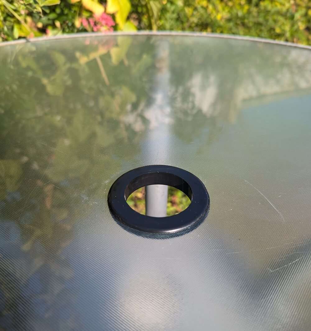 We provide a black parasol ring protector that fits into the hole of your glass table top. It is easy to install and offers protection for both the glass and the umbrella. The universal size is made from flexible rubber, allowing it to fit holes of various sizes.
